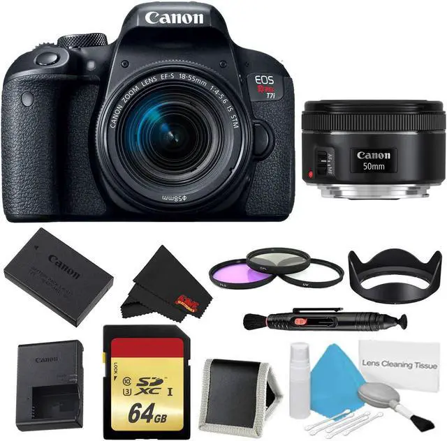 Packing a versatile feature-set in a sleek and portable body, the EOS Rebel T7i DSLR from Canon offers advanced imaging capabilities along with a convenient range of controls and connectivity. Utilizing a 24.2MP APS-C CMOS sensor and DIGIC 7 image processor, the Rebel T7i is able to capture high-resolution stills and video with an expanded sensitivity range of ISO 100-51200 to suit working in a wide variety of lighting conditions. The sensor and processor combination also avails 6 fps continuous shooting for working with moving subjects. Benefitting the imaging attributes, the sensor's design also facilitates Dual Pixel CMOS AF, which uses phase-detection autofocus for quick, accurate, and smooth focusing performance when recording movies or shooting stills in live view. When shooting stills using the optical viewfinder, a 45-point all cross-type phase-detection system is used for quick and accurate focusing in a variety of shooting scenarios.