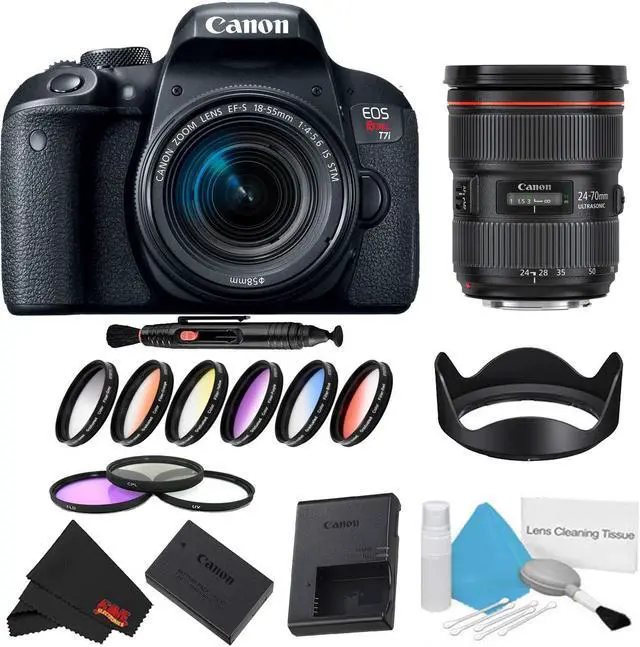 Packing a versatile feature-set in a sleek and portable body, the EOS Rebel T7i DSLR from Canon offers advanced imaging capabilities along with a convenient range of controls and connectivity. Utilizing a 24.2MP APS-C CMOS sensor and DIGIC 7 image processor, the Rebel T7i is able to capture high-resolution stills and video with an expanded sensitivity range of ISO 100-51200 to suit working in a wide variety of lighting conditions. The sensor and processor combination also avails 6 fps continuous shooting for working with moving subjects. Benefitting the imaging attributes, the sensor's design also facilitates Dual Pixel CMOS AF, which uses phase-detection autofocus for quick, accurate, and smooth focusing performance when recording movies or shooting stills in live view. When shooting stills using the optical viewfinder, a 45-point all cross-type phase-detection system is used for quick and accurate focusing in a variety of shooting scenarios.