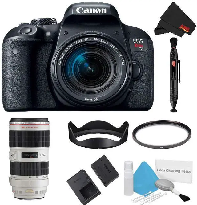 Bundle Items Include: Canon EOS Rebel T7i DSLR Camera with EF-S 18-55mm f/4- 5.6 IS STM Lens (International Model) Canon 70-200mm 2.8L USM IS II Lens (International Model) LP-E17 Lithium-Ion Battery PackLC-E17 Charger for LP-E17 Battery PackEyecup Ef for Digital Rebel CamerasRF-3 Body Cap for Canon EOS CamerasEW-400D Wide Strap58mm UV Filter 77mm UV Filter 58mm Tulip Lens HoodLens Pen Cleaner5 Piece Lens Cleaning KitMicrofiber Cloth