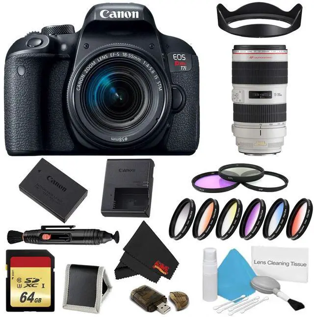 Bundle Items Include: Canon EOS Rebel T7i DSLR Camera with EF-S 18-55mm f/4- 5.6 IS STM Lens (International Model) Canon 70-200mm 2.8L USM IS II Lens (International Model) LP-E17 Lithium-Ion Battery PackLC-E17 Charger for LP-E17 Battery PackEyecup Ef for Digital Rebel CamerasRF-3 Body Cap for Canon EOS CamerasEW-400D Wide Strap64GB UHS-I SDXC Memory Card (Class 10) 58mm Graduated Color Filter Kit58mm 3Pc Filter Kit77mm UV Filter 58mm Tulip Lens HoodLens Pen Cleaner5 Piece Lens Cleaning KitUSB Card ReaderMemory Card WalletMicrofiber Cloth