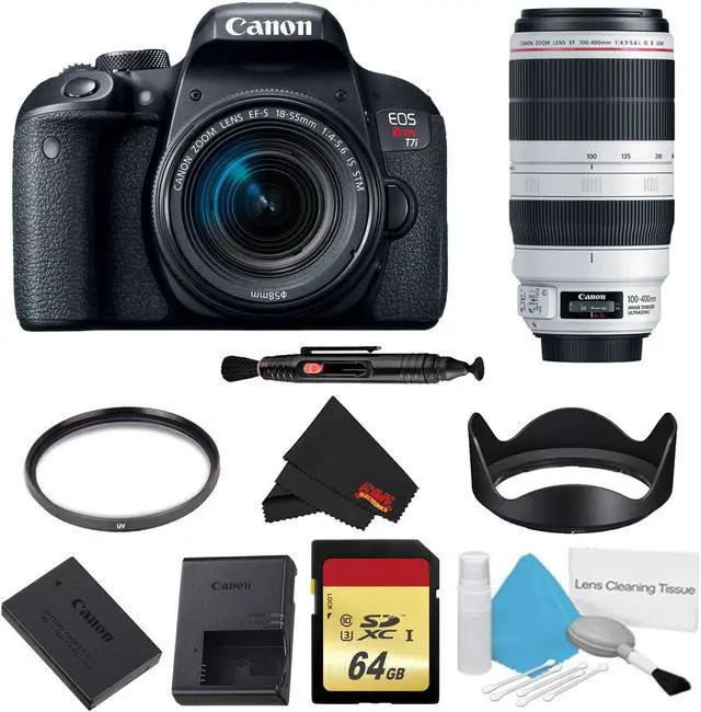 Packing a versatile feature-set in a sleek and portable body, the EOS Rebel T7i DSLR from Canon offers advanced imaging capabilities along with a convenient range of controls and connectivity. Utilizing a 24.2MP APS-C CMOS sensor and DIGIC 7 image processor, the Rebel T7i is able to capture high-resolution stills and video with an expanded sensitivity range of ISO 100-51200 to suit working in a wide variety of lighting conditions. The sensor and processor combination also avails 6 fps continuous shooting for working with moving subjects. Benefitting the imaging attributes, the sensor's design also facilitates Dual Pixel CMOS AF, which uses phase-detection autofocus for quick, accurate, and smooth focusing performance when recording movies or shooting stills in live view. When shooting stills using the optical viewfinder, a 45-point all cross-type phase-detection system is used for quick and accurate focusing in a variety of shooting scenarios.