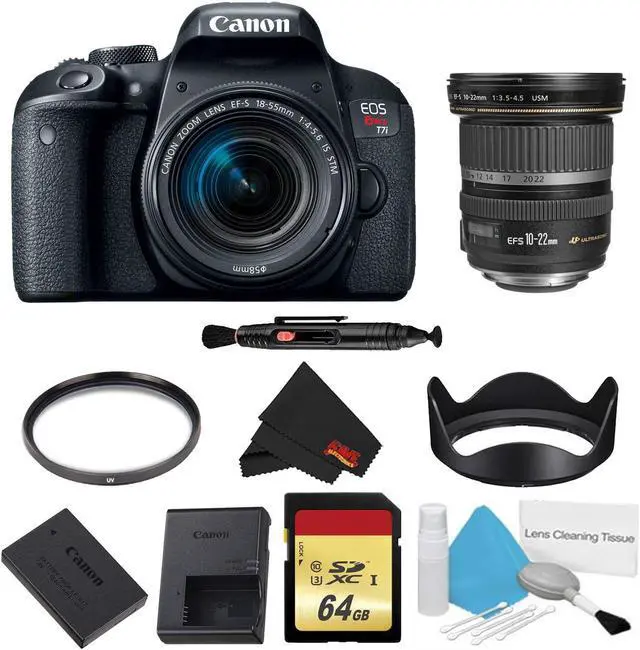Packing a versatile feature-set in a sleek and portable body, the EOS Rebel T7i DSLR from Canon offers advanced imaging capabilities along with a convenient range of controls and connectivity. Utilizing a 24.2MP APS-C CMOS sensor and DIGIC 7 image processor, the Rebel T7i is able to capture high-resolution stills and video with an expanded sensitivity range of ISO 100-51200 to suit working in a wide variety of lighting conditions. The sensor and processor combination also avails 6 fps continuous shooting for working with moving subjects. Benefitting the imaging attributes, the sensor's design also facilitates Dual Pixel CMOS AF, which uses phase-detection autofocus for quick, accurate, and smooth focusing performance when recording movies or shooting stills in live view. When shooting stills using the optical viewfinder, a 45-point all cross-type phase-detection system is used for quick and accurate focusing in a variety of shooting scenarios.