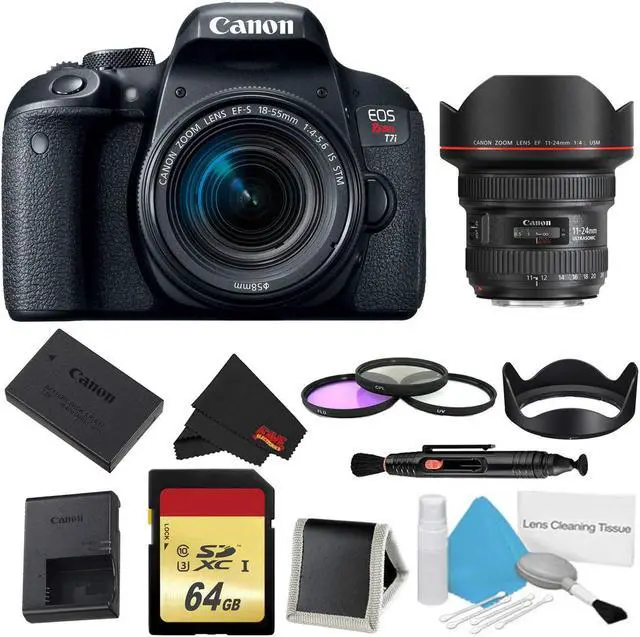 Packing a versatile feature-set in a sleek and portable body, the EOS Rebel T7i DSLR from Canon offers advanced imaging capabilities along with a convenient range of controls and connectivity. Utilizing a 24.2MP APS-C CMOS sensor and DIGIC 7 image processor, the Rebel T7i is able to capture high-resolution stills and video with an expanded sensitivity range of ISO 100-51200 to suit working in a wide variety of lighting conditions. The sensor and processor combination also avails 6 fps continuous shooting for working with moving subjects. Benefitting the imaging attributes, the sensor's design also facilitates Dual Pixel CMOS AF, which uses phase-detection autofocus for quick, accurate, and smooth focusing performance when recording movies or shooting stills in live view. When shooting stills using the optical viewfinder, a 45-point all cross-type phase-detection system is used for quick and accurate focusing in a variety of shooting scenarios.