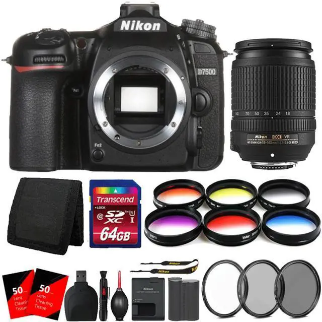 Designed as a true all-arounder, the Nikon D7500 is a DX-format DSLR offering a versatile feature-set to appeal to photographers and videographers alike. Based on a 20.9MP CMOS sensor and EXPEED 5 image processor, this multimedia maven avails an 8 fps continuous shooting rate for up to 100 consecutive JPEGS, a native sensitivity range to ISO 51,200 that can be expanded up to ISO 1,640,000, and 4K UHD video and time-lapse recording capabilities. Complementing the imaging capabilities is a 51-point Multi-CAM 3500FX II autofocus system, which features 15 cross-type points for fast performance and accurate subject tracking capabilities in a variety of lighting conditions. MPN: 1581 UPC: 635322932915 This listing includes the following: 18-140mm 67mm Color Filter UV CPL ND Filter Kit 64GB Memory Card Wallet Reader 100 Lens Tissue Lens Pen Dust Blower