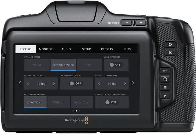 The Blackmagic Pocket Cinema Camera 6K Pro also includes built-in 2, 4, and 6 stop ND filters, adjustable tilt HDR LCD with a bright 1500 nits, two mini XLR audio inputs, and a larger NP-F570 style battery. The camera's front and top feature record start/stop and still photo buttons along with dedicated controls for iris, ISO, white balance, and shutter speed.