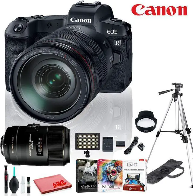 Manufacturer Included Items: Canon EOS RP Mirrorless Digital Camera with 24-105mm LensRF 24-105mm f/4L IS USM LensLP-E17 Lithium-Ion Battery PackLC-E17 Charger for LP-E17 Battery PackR-F-5 Camera CoverER-EOSRP StrapBundle Items Include: 1 x Sigma 105mm f/ 2.8 EX DG OS HSM Macro Lens for Canon1 x 72 Inch Professional Heavy-Duty Aluminum Camera/Video Tripod 1 x Corel Mac Photo Essentials Software Kit - Includes Corel AfterShot, Corel Painter Essentials 5, Roxi1 x Portable Video LED Light1 x Table Top Tripod, Lens Cleaning Kit, LCD Protector1 x High Quality Dust Blower1 x Lens Pen Cleaner