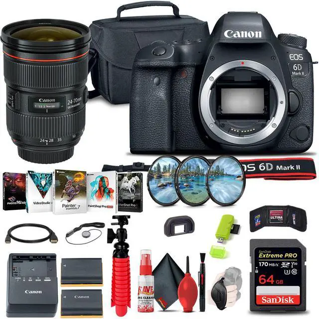 Step up into the full-frame game with the EOS 6D Mark II DSLR Camera from Canon . Making high-performance full-frame imaging more accessible, the 6D Mark II makes numerous advancements over its predecessor to improve upon every aspect of image capture and creation. The main update comes in the form of a 26.2MP CMOS sensor and the use of the DIGIC 7 Image Processor to deliver sharper, more vivid imagery in a variety of shooting situations. This setup offers an improved native sensitivity range of ISO 100-40000, which can then be expanded to ISO 50-102400, as well as speedy shooting rates of up to 6.5 fps.
