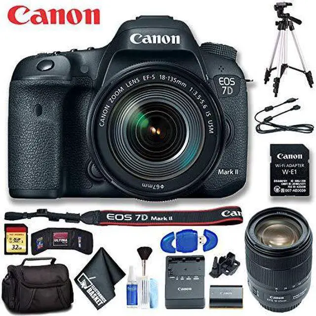 An already very capable imaging machine, the EOS 7D Mark II DSLR Camera with 18-135mm Lens and W-E1 Wi-Fi Adapter from Canon takes the camera's capabilities up a notch with the inclusion of an SD-card-sized item that adds Wi-Fi connectivity to the camera.Designed with a penchant for speed, the 7D Mark II is characterized by its APS-C-sized 20.2MP CMOS sensor, dual DIGIC 6 image processors, and a top continuous shooting rate of 10 fps. Both a 65-point all cross-type phase-detection AF system and Dual Pixel CMOS AF technology benefit fast, accurate focusing performance for both optical viewfinder and live view shooting. Additionally, the combination of the dual image processors along with the CMOS sensor also contribute to enhanced low-light sensitivity to a native ISO 16000, which is further expandable to ISO 51200. The 7D Mark II comfortably performs in a range of challenging situations, and while ideally situated as a tool for sports and wildlife photographers, it resides equally as well in the hands of contemporary multimedia image-makers.