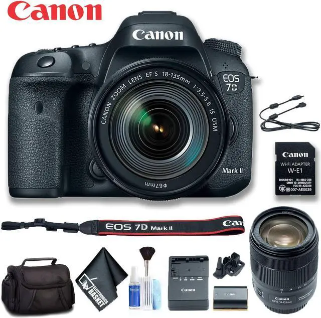 An already very capable imaging machine, the EOS 7D Mark II DSLR Camera with 18-135mm Lens and W-E1 Wi-Fi Adapter from Canon takes the camera's capabilities up a notch with the inclusion of an SD-card-sized item that adds Wi-Fi connectivity to the camera.Designed with a penchant for speed, the 7D Mark II is characterized by its APS-C-sized 20.2MP CMOS sensor, dual DIGIC 6 image processors, and a top continuous shooting rate of 10 fps. Both a 65-point all cross-type phase-detection AF system and Dual Pixel CMOS AF technology benefit fast, accurate focusing performance for both optical viewfinder and live view shooting. Additionally, the combination of the dual image processors along with the CMOS sensor also contribute to enhanced low-light sensitivity to a native ISO 16000, which is further expandable to ISO 51200. The 7D Mark II comfortably performs in a range of challenging situations, and while ideally situated as a tool for sports and wildlife photographers, it resides equally as well in the hands of contemporary multimedia image-makers.