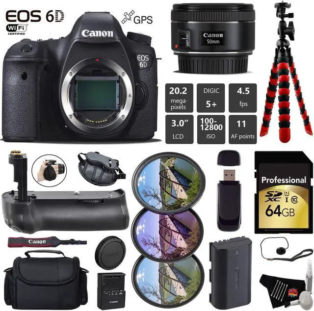 The Canon EOS 6D is a full-frame 20.2MP DSLR offering exceptionally high image quality and detail while providing compatibility and convenience through its design and features. When paired with the powerful DIGIC 5+ image processor and 14-bit A/D conversion, the full-frame sensor is capable of recording vivid imagery with expanded sensitivity up to ISO 102400.