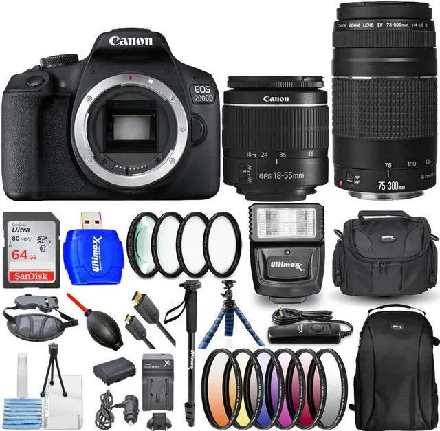 Compact and capable, the Canon EOS 2000D is a sleek entry-level DSLR featuring versatile imaging capabilities and a helpful feature-set. Incorporating a 24.1MP APS-C CMOS sensor and DIGIC 4+ image processor, the 2000D produces high-resolution stills with notable clarity, reduced noise, and a flexible native sensitivity range from ISO 100-6400 for working in a variety of lighting conditions. The sensor and processor also afford shooting continuously at up to 3 fps for photographing moving subjects, as well as Full HD 1080/30p video recording. Benefitting shooting with the optical viewfinder, a 9-point AF system incorporates a single center cross-type AF point for increased accuracy and focusing speed, and a contrast-detection focusing system offers refined autofocus precision when recording video or photographing in live view. The rear 3.0" 920k-dot LCD offers a bright, clear image for playback and review, and built-in Wi-Fi with NFC also offers the ability to wirelessly share imagery from your camera to a linked mobile device for instant online sharing.