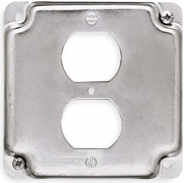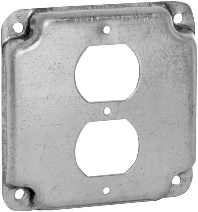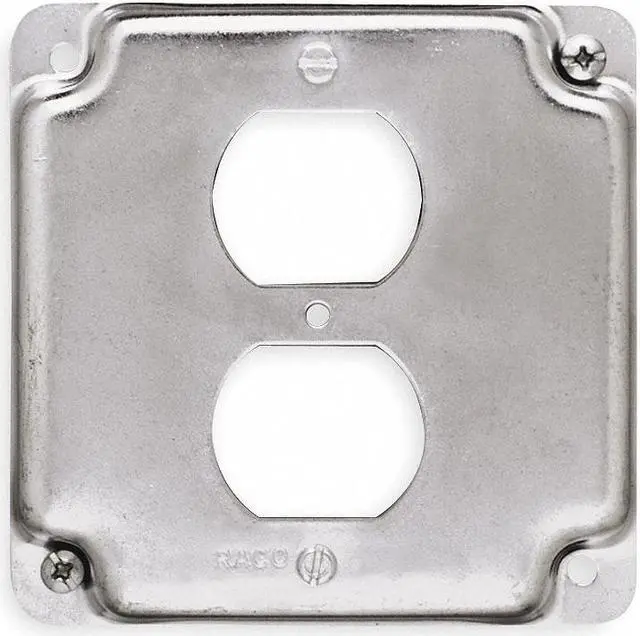 Electrical Box Cover, Box Type Square, Cover Type Duplex Receptacle, Number of Gangs 1, Material Galvanized Zinc, Depth 1/2 in, Width 4 in, Length 4 in, Characteristics Duplex Receptacle, Capacity 6.5 cu in, Raised Height Not Applicable, Color Gray, Design Crushed Corner, Includes Screws. This item has been restricted from sale in the following state (s): []
