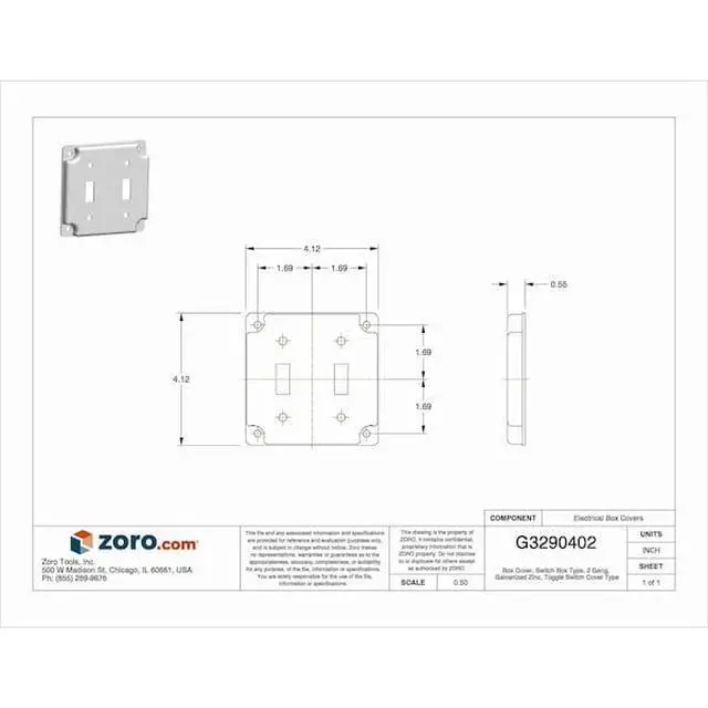 Electrical Box Cover, Box Type Square, Cover Type Toggle Switch, Number of Gangs 2, Material Galvanized Zinc, Depth 1/2 in, Width 4 in, Length 4 in, Characteristics 2 Toggle Switches, Capacity 6.5 cu in, Raised Height 1/2 in, Design Crushed Corner, Includes Screws
