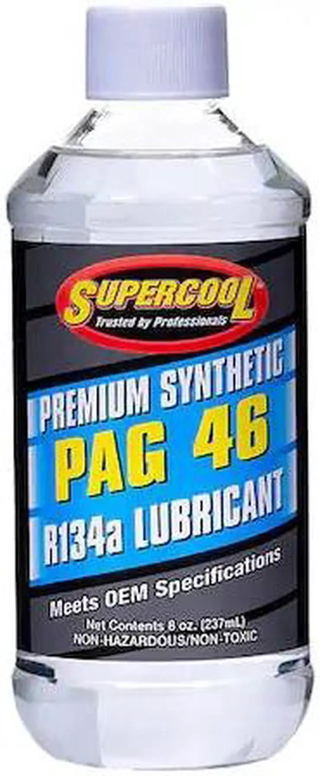 A/C Compressor PAG Lubricant, Compatible Refrigerant Systems R-134a, Container Type Bottle, Container Size 8 oz, Compatible Lubricant PAG Lubricants, Color Yellow, PAG Viscosity Grade PAG 46, Viscosity Index 46, Standards ANSI-ASHRAE 97-1989, ASTM D1401, ASTM D2270, ASTM D2783, ASTM D4052, ASTM D445, ASTM D92, ASTM D97, ASTM D972, ASTM D974, ASTM E203, FZG, Modified IP48, Product Type PAG Oil, Additives Included Anti-Wear Additives, UV Dye, Boiling Point 392 Degrees F. This item has been restricted from sale in the following state (s): []