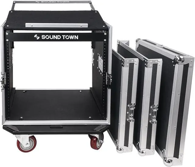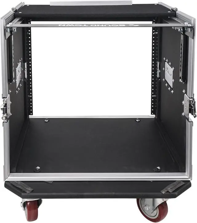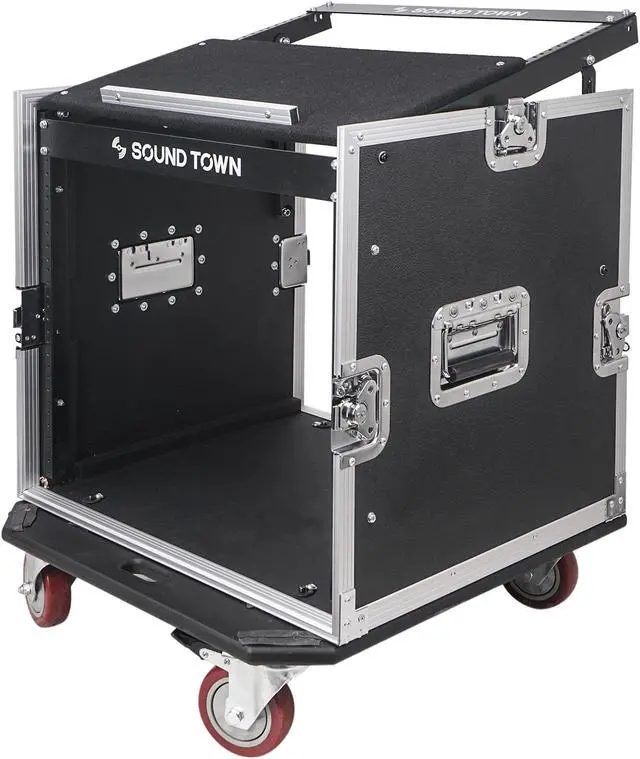 The Sound Town flight cases are designed and manufactured to withstand the rigors of the road! Made with a lightweight aluminum frame and commercial grade laminated plywood, these road cases will protect your gear from the damage and destruction that can occur in between gigs. The recessed carry handles are designed to provide comfort while moving your gear around. The Sound Town road cases also come with heavy-duty twist butterfly latches, which keep your gears securely locked in the cases and won’t bounce open on accident. The 10U and 12U road cases also come with 4” casters, making loading and unloading painless.