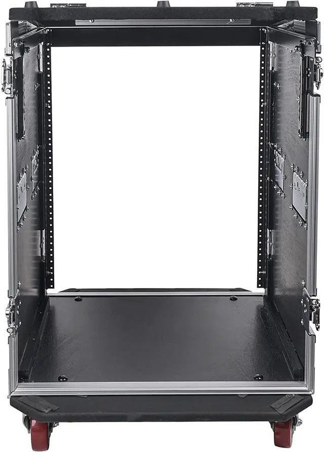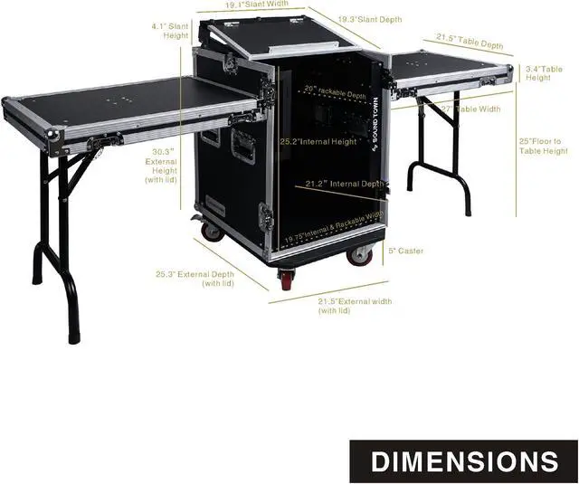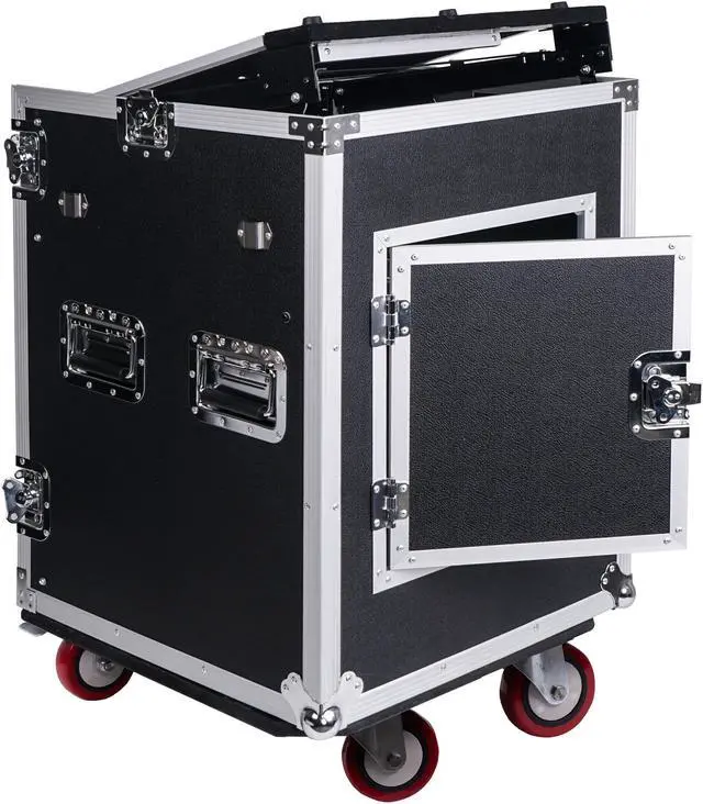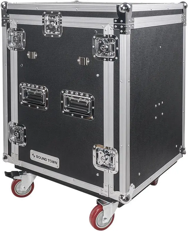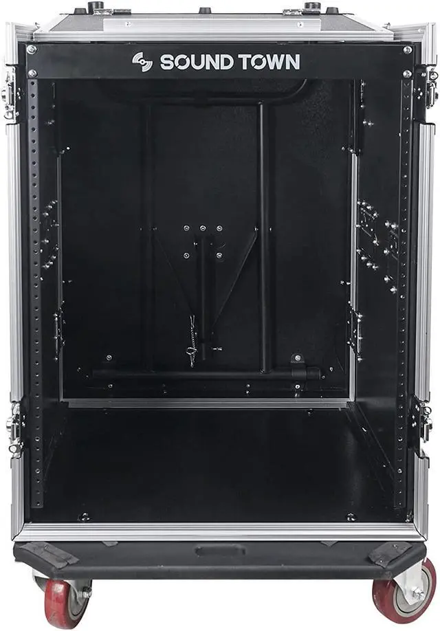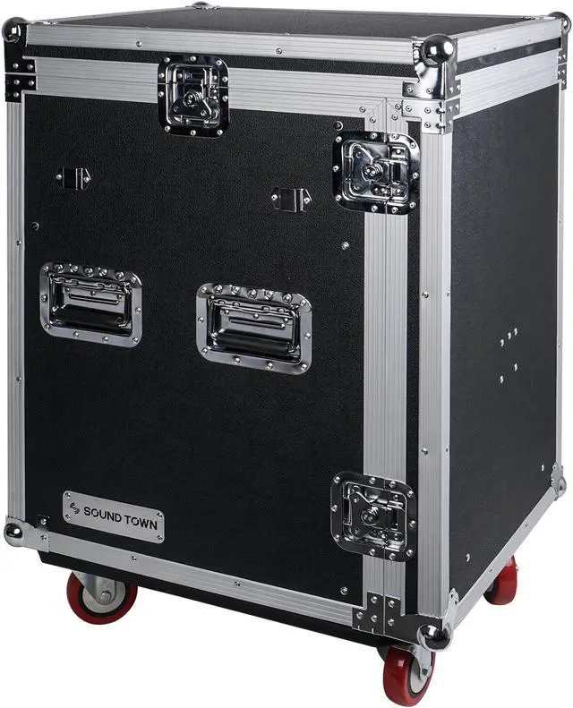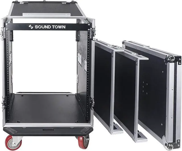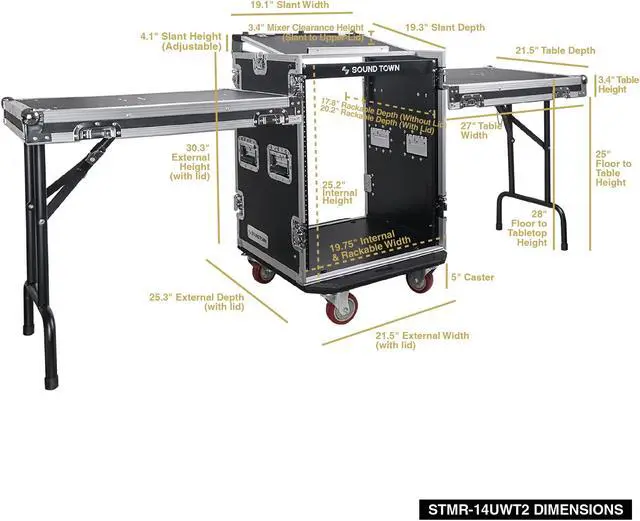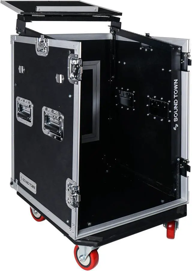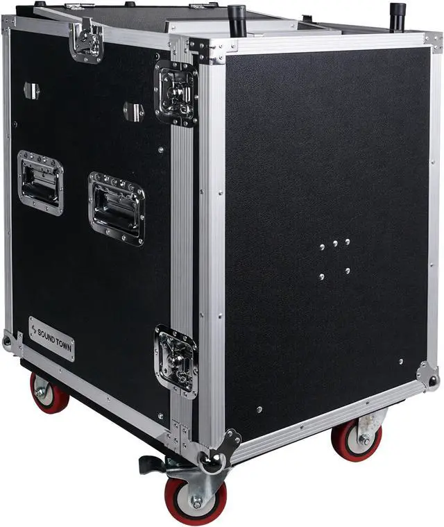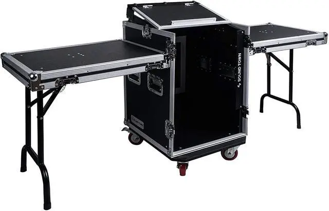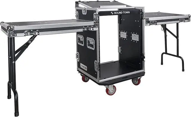 Sound Town 14U PA DJ Rack/Road Case with Slant Mixer Top and 2 Standing Lid Tables and Casters, 14-Space Size (STMR-14UWT2) The Sound Town STMR-14UWT2 is a 14U flight case that features a rugged exterior and steel recessed hardware to keep your PA gears snug and safe. The case comes with heavy-duty plywood, industrial-grade latches and casters and keeps your equipment from bumps and bruises of lading in and out. The black laminate gives the flight case a sleek look. The attachable standing lid tables can be turned into your workshop and keep your gear organized and easily accessible during your professional events.