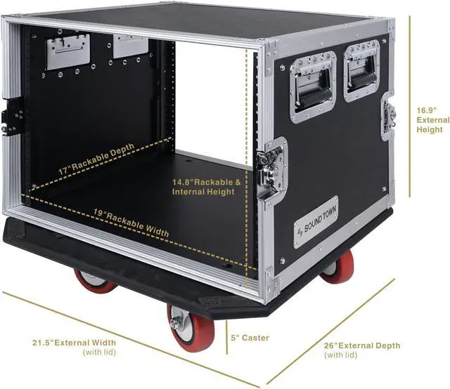 The Sound Town STRC-8UW flight case is designed to meet the needs of musicians and pro audio professionals. The rack case comes with aluminum-reinforced plywood and metal corners to protect your gear when you're on the go. It is equipped with 8U rack space and a standard 17” depth. Its removable front and rear covers provide easy and maximum access to rack rails. Better yet, its heavy-duty twist latches keep your gears securely locked in and its rubber-gripped handles together with casters make it easy to transport.