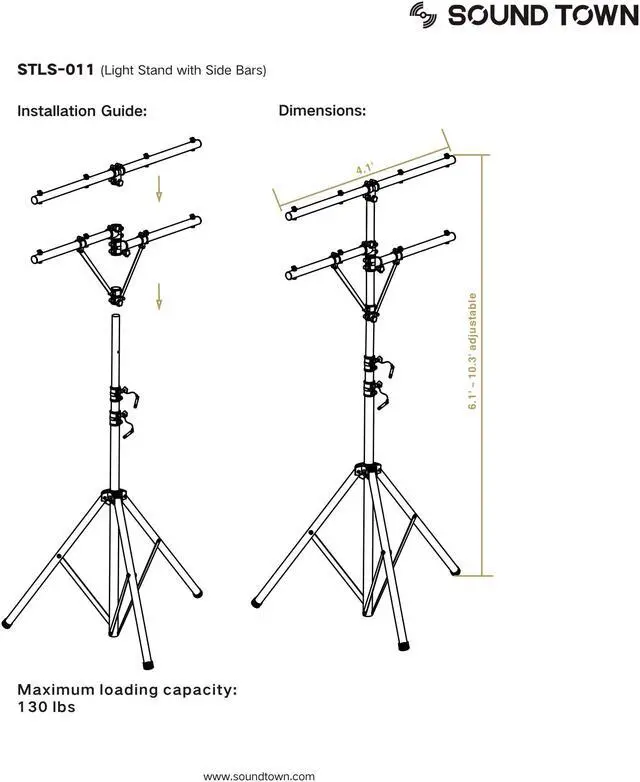 The Sound Town STLS-011 is a portable lighting stand system with side bars and tripod base. It comes with sturdy steel construction and enables you to quickly set up an outstanding light show, with maximum weight capacity of 130 lbs (when evenly distributed). The T-bar and two side bars can accommodate up to 8 par cans with 8 separate mounting points.