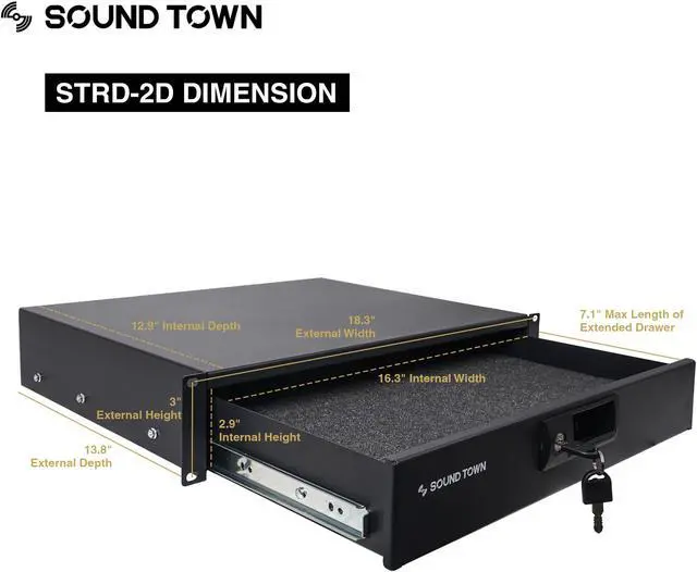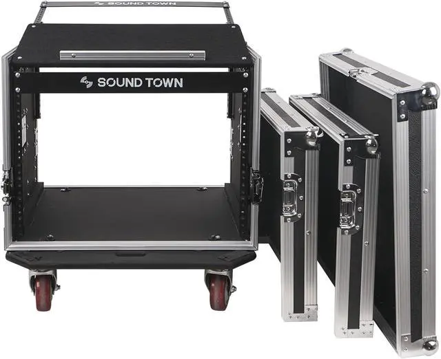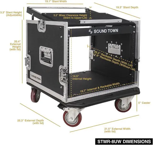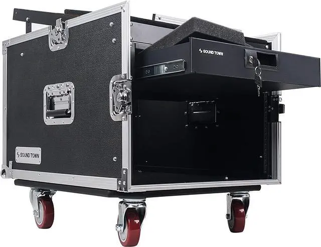 The Sound Town STMR-8D2 is a 8U road case with 23.7“ rackable depth and 13U slant mixer top, which enables you to mount your mixer on the top fo easy control access and the other gears down below. Better yet, it also come with a sturdy steel locking drawer with protection foam inside to hold your notebooks, tablets, small purses, microphones, cables and etc.
