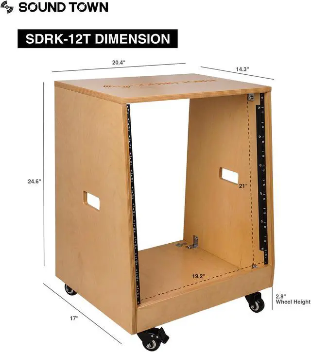 The Sound Town SDRK-12T is a 12U DIY studio rack with 19“ width. The panels are made from top-quality plywood, finished with a beautiful golden oak coat and can be easily assembled. If you’re in the market for an affordable studio rack and you enjoy hands-on builds, the Sound Town SDRK-12T case kit is the perfect option. It can be built to hold amplifiers, wireless microphone receivers and other 19“ wide rack mountable equipment in your home or studio. It brings a great combination of style and function into your studio.