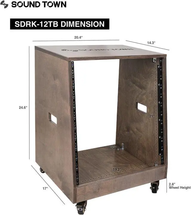 The Sound Town SDRK-12TB is a 12U DIY studio rack with 19“ width. The panels are made from top-quality plywood, finished with a beautiful weathered gray coat and can be easily assembled. If you’re in the market for an affordable studio rack and you enjoy hands-on builds, the Sound Town SDRK-12TB case kit is the perfect option. It can be built to hold amplifiers, wireless microphone receivers and other 19“ wide rack mountable equipment in your home or studio. It brings a great combination of style and function into your studio.
