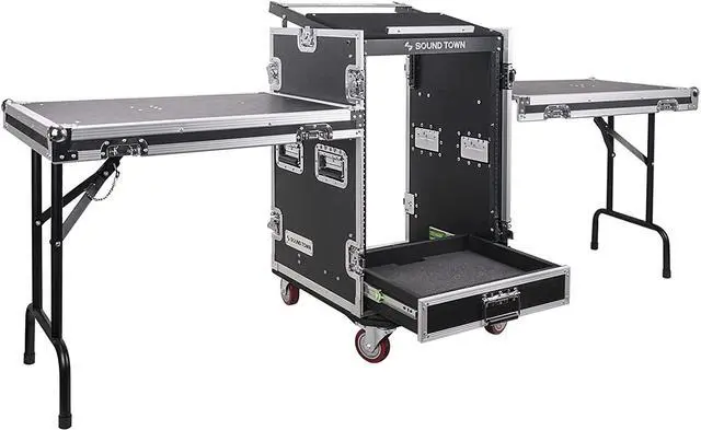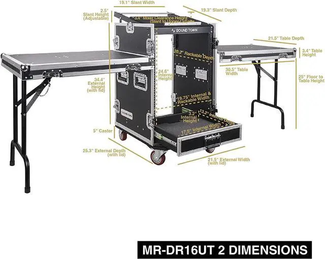 Sound Town 16U PA DJ Pro Audio Rack/Road ATA Case with 2U Drawer, 11U Slant Mixer Top, Two DJ Work Tables, Casters, Pro Tour Grade (MR-DR16UT2)