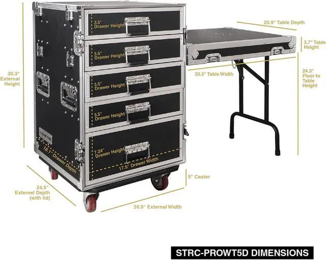 The Sound Town STRC-PROWT5D is a modular stage and studio equipment case and offers a convenient solution for setting up a workstation on the go. It comes with 5 drawers in different sizes for easy access to your equipment and each drawer has a 5mm EVA pad inside. The system also has one detachable lid table which can be quickly turned into a workstation. The case is built with 1/2" (12mm) plywood and can be easily moved around with pro-grade casters and rubber-cushioned handles.