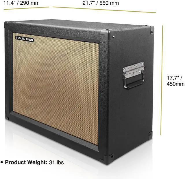 The Sound Town GUC112BK is a 1 x 12 guitar cabinet with 65W power handling capability. Featuring a top-quality 12 speaker, it delivers impressive low end, clear midrange, and chiming highsideal for rock, blues, and a wide range of music styles.