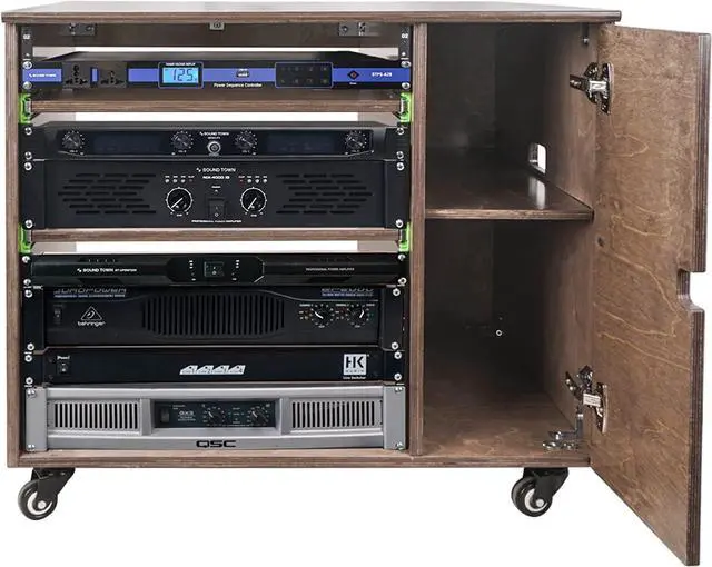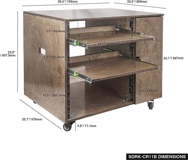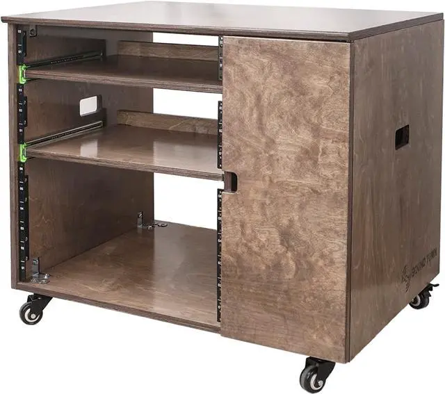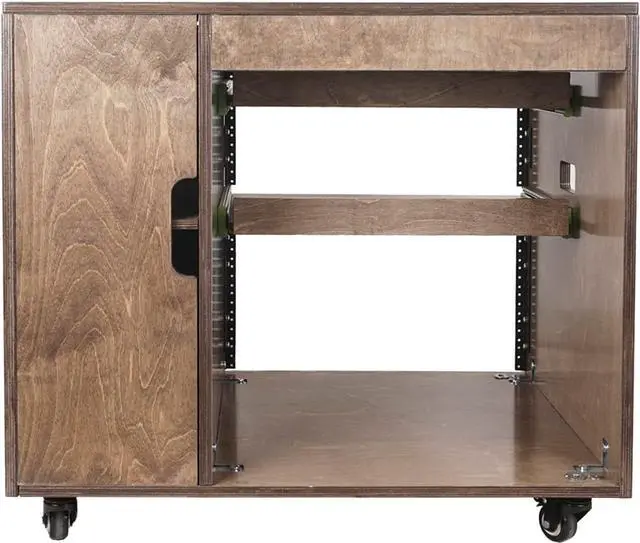 The Sound Town SDRK-CR11B is an 11U plywood studio rack and offers plenty of room for preamps, effects processors, and similar pro audio gear. Its top surface provides a great fit for your turntable, a tabletop audio interface, or a small mixer. Two slide-out trays easily fit small MIDI controllers and drum machines. The cabinet includes a soft-close door, and stores small accessories such as cables, microphones, and more.