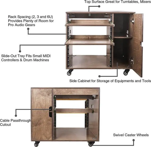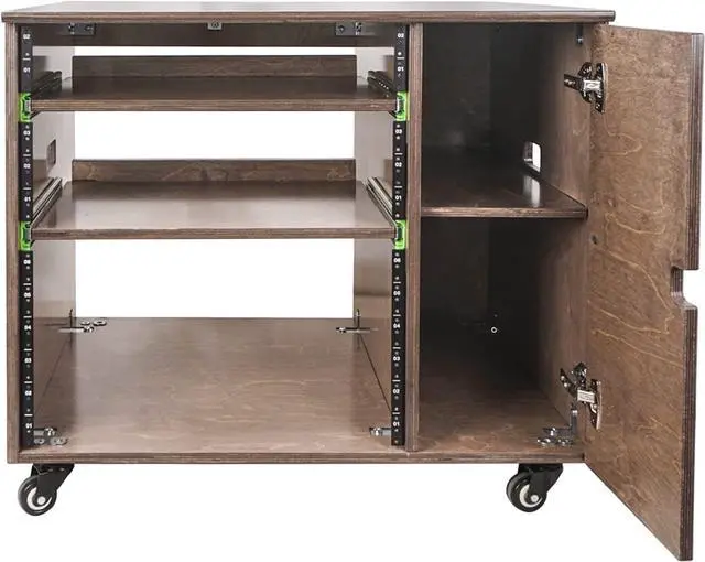 With birch plywood construction, the studio rack cabinet looks great with a beautiful weathered gray coat. Four rubberized casters are included in the package, with two of them coming with lever brakes for easy mobility and maximum stability.