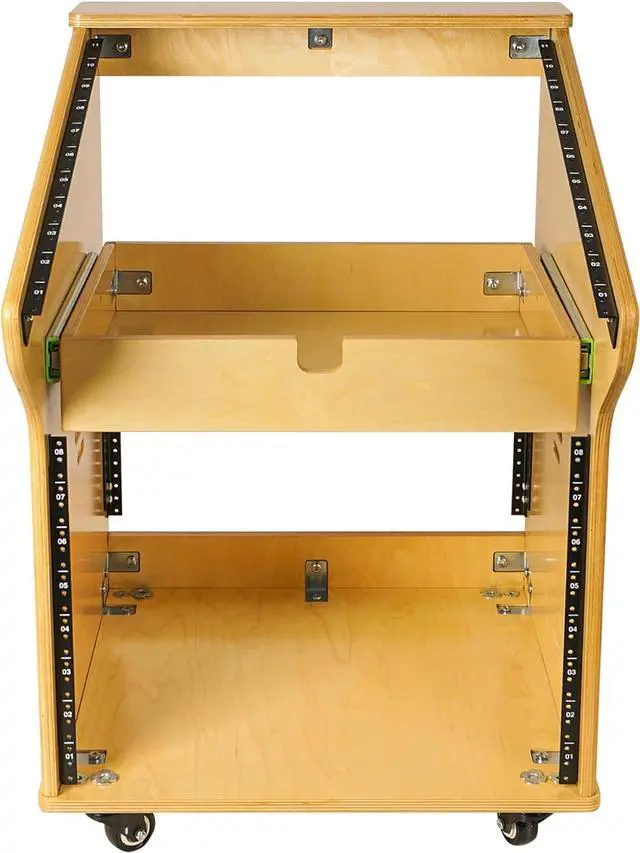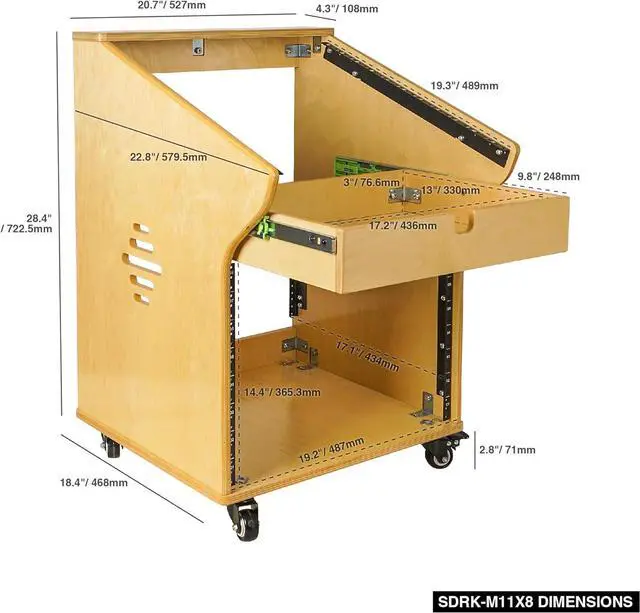 The SDRK-M11X8 seamlessly integrates an 11U slant mixer top, 8U front rack space, 4U rear rack space, and a handy slide-out 2U drawer. Say goodbye to clutter and keep your equipment and accessories impeccably organized in one convenient location. Constructed from high-quality Baltic plywood, it features a Golden Oak finish. Elevate the aesthetics of your studio or stage with our meticulously crafted our studio rack case.