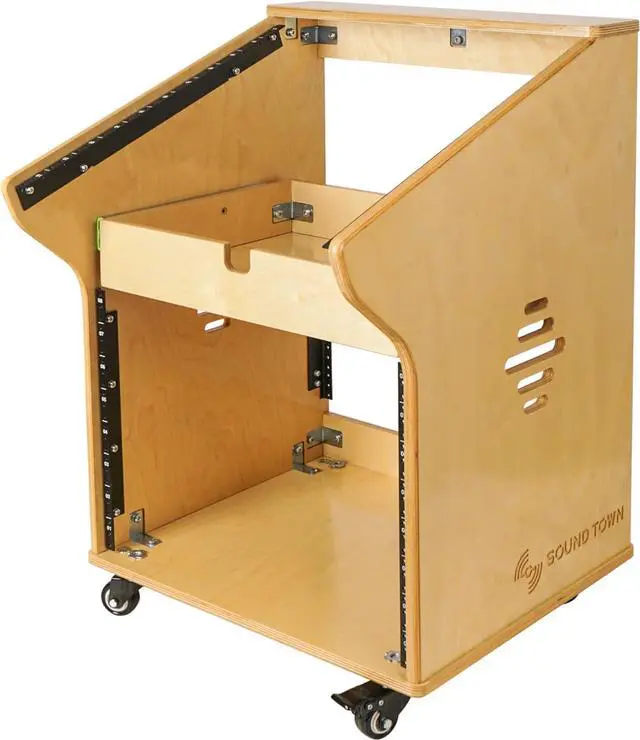 Sound Town DIY Studio Rack with 11U Slant Mixer Top, 8U Front, 2U Drawer, Rubber Feet, Casters, Baltic Plywood, Golden Oak (SDRK-M11X8)