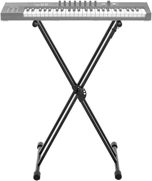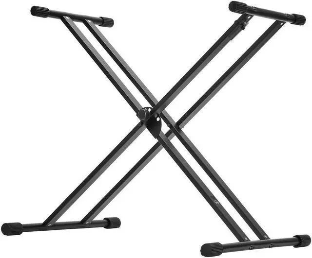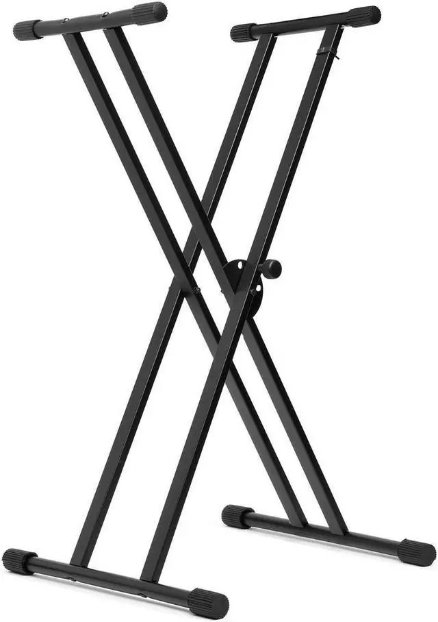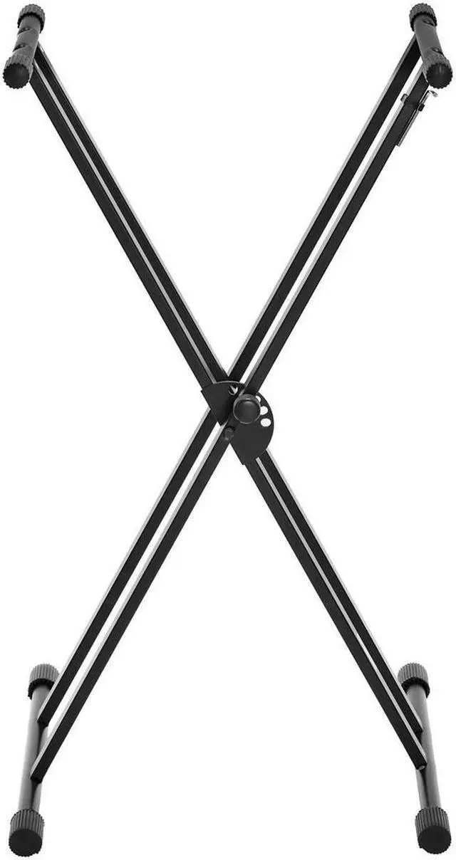 To ensure stability and prevent any slippage, all eight contact points - comprising four legs and four support bars - are equipped with rubber sleeves. These provide a firm grip on any floor surface and prevent your keyboard from sliding off the stand. When it's time to pack up, the same crossbar design, coupled with the clutch lock, allows for a quick and effortless folding of the stand. This transforms it into a compact configuration, making it highly portable and easy to store. The H&A Double-X Keyboard Stand with Easy Lock is not just a stand; it's a versatile tool designed to enhance your musical experience.