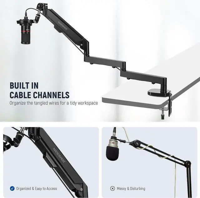 Hidden Cable Organizer & Tidy Workspace Multiple cable channels organize and conceal tangled wires, creating a tidy workspace that allows more focuses on content creation, online meetings or broadcasting. The enlarged desktop C clamp with non slip pads holds firmly to the table with a 0.4" - 3.1" /10-80mm thickness