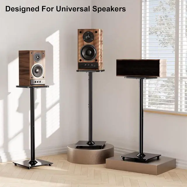Stability & Sturdiness: Our floor speaker stands crafted from premium alloy steel and an 11.8" glass base, offer the stability to your speaker. You can choose from two types of foot pads (metal feet and rubber feet) to ensuring your cherished carpet or floor without scratches and provide more stability