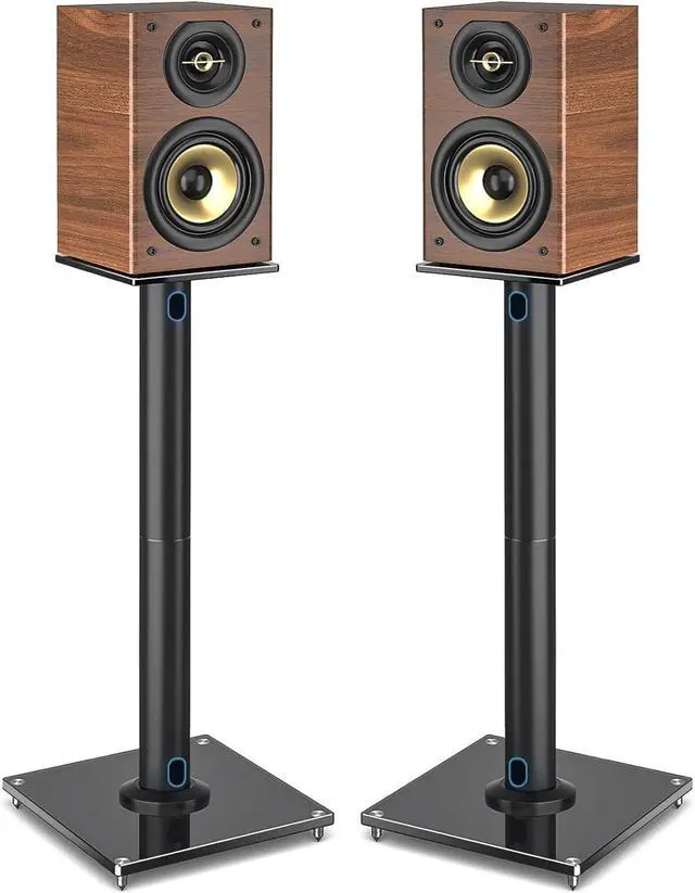TWO FOOT PADS CHOICE - PROTECT YOUR CHERISHED FLOOR OR CARPET: The bookshelf speaker stand is provided with two kinds of feet (metal feet and rubber feet), which can be freely installed as needed. Whether it's wood, concrete, tile floor, or carpet, it will protect your cherished floor or carpet from scratches. The 7.8 -inch square glass top plate with rubber pad ensures the stability of your speakers to reduce vibration for better sound quality. A beautiful addition to your audio system.