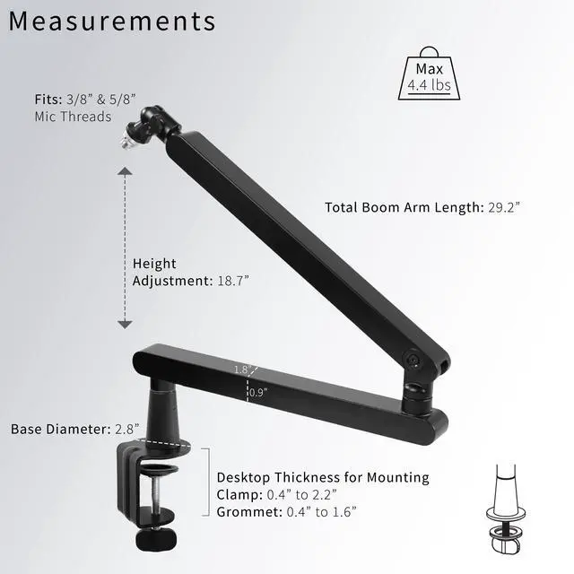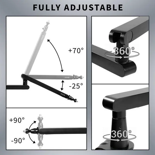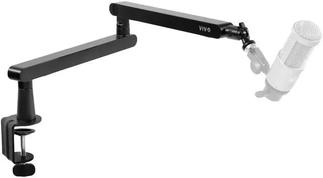 Get ready to broadcast in style with Black Low Height Microphone Desk Mount (STAND-MIC03L) from VIVO! The stand is adjustable with tilt, full rotation, and height transitions for desired mic placement. Featuring a heavy-duty C-clamp and optional grommet for secure mounting options, built-in cable management for an organized appearance, foldable arms for easy storage, and a low profile design for space efficiency, this mic stand is made to perform! Perfect for recording, podcasting, gaming, music, and much more. Minimal assembly is required out of the box, so you can get your new microphone setup ready in no time!