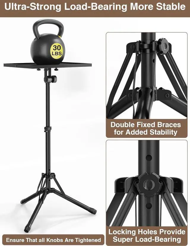 Super Load-Bearing: KOOV laptop floor stand exclusive locking hole design, allows this projector stand tripod to hold up to 30 pounds and more, so not only a portable projector can fit, but also a large or standard device