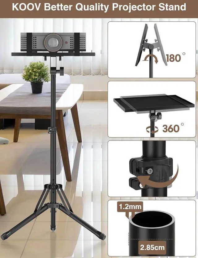 Multi-functional Tripod Stand: KOOV heavy-duty projector stand tripod, the tray size is 15x 11 and has raised edges for safety, supports multiple specifications of equipment, such as laptops, projectors, recorders, music notes, sound media DJ equipment, podium stand portable etc