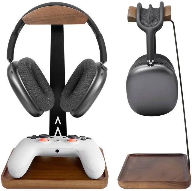 GEVO Headphone Stand for Desk - Walnut Wood & Aluminum Headset Stand, Universal Walnut Wooden Gaming Headphone Holder for AirPod Max, Bose, Sony, Razer, Jabra, JBL
