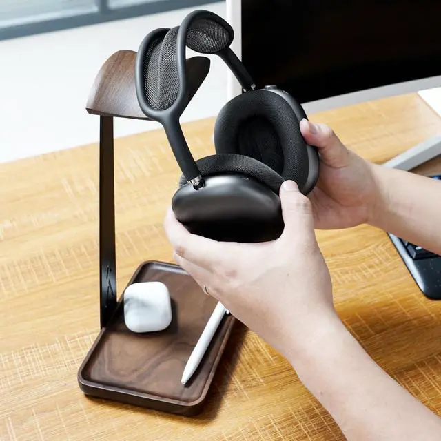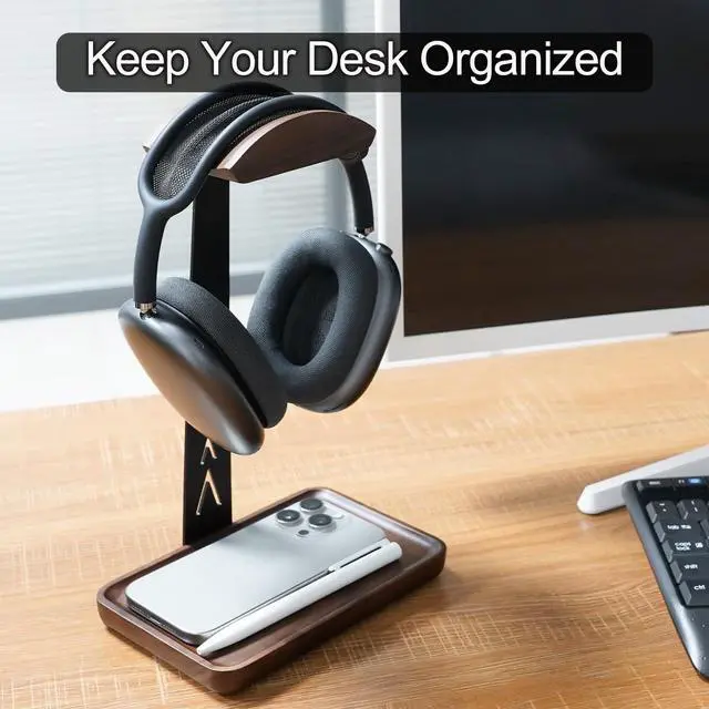 Functional Organization: Our walnut headphone stand features an integrated storage tray at the base, perfect for keeping small essentials like apple airPods, earphones, keys, cables, controllers or USB drives neatly organized