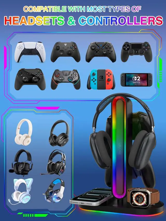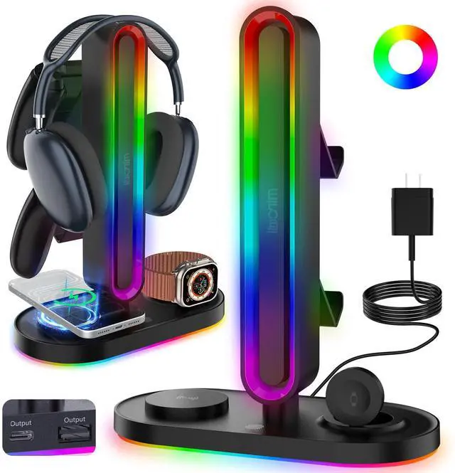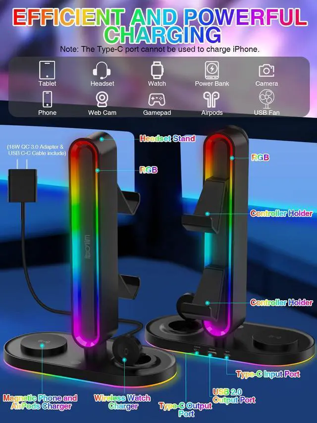 RGB Headset Stand with Wireless Charger, 8-in-1 Charging Station for iPhone, Samsung, Apple Watch Type-C/USB Ports, Gaming Headphone & Controllers Holder, Organizer for Desk Includes 20W PD Adapter