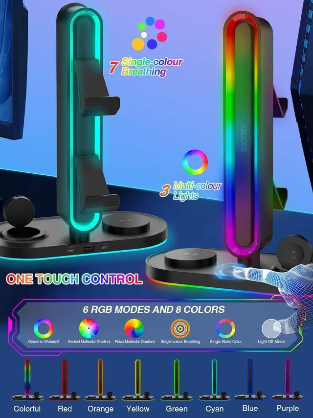 Immersive RGB Lighting with Smart Touch Control: Set the mood for victory with 8 vibrant colors (Rainbow, Red, Orange, Yellow, Green, Cyan, Blue, Purple) and 6 dynamic lighting modes(Breathing, Static, Flash, Gradient, Pulse, Off). The innovative fingerprint-touch control turns on/off or cycles through modes seamlessly, adding a futuristic vibe to your gaming rig, streaming background, or office desk. Note: One touch to switch colors, double-touch to switch modes, and long press to turn on/off.