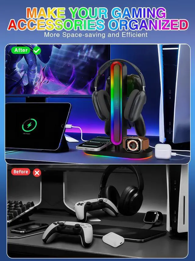 Organized Gaming Stand & Controller Holder: Tame the cable chaos! This stand perfectly holds your beloved headset (like Steel-Series Ar ctis, Ra zer Kra ken, or So ny WH-1000X M5, etc) on top. The side neatly stores 2 most-used game controllers: P-S 4/P-S 5/X-box Series X/S/X-box One Controller, or Nint-endo Swit-ch Pro Controller, etc. Keeping your battlefield within reach and say goodbye to clutter.
