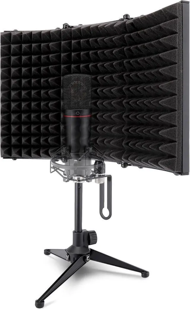 TRIPOD BASE: The folding isolation shield features tripod base design for stability w/ universal standard mic threading. Lets you achieve a more crisp sound preferred by music professionals. Measures 13.2 x 7.2 x 15.6 and comes in charcoal gray
