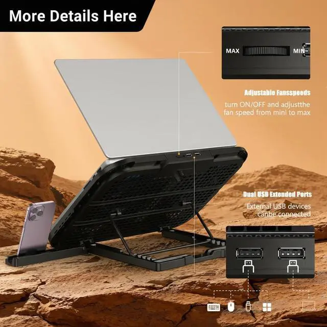 In terms of humanized design, the radiator is equipped with a reversible anti-skid pad, which can firmly fix the laptop, and there is no need to worry about slipping even when tilted; the 5-level adjustable bracket height meets the user's usage needs in different scenarios, whether it is office, study or entertainment, you can find the most comfortable viewing and operation angle. In addition, the radiator is also equipped with 2 USB ports, which is convenient for users to connect other USB devices. It also supports USB power supply, plug and play, and does not require an additional power supply, which is extremely convenient to use.