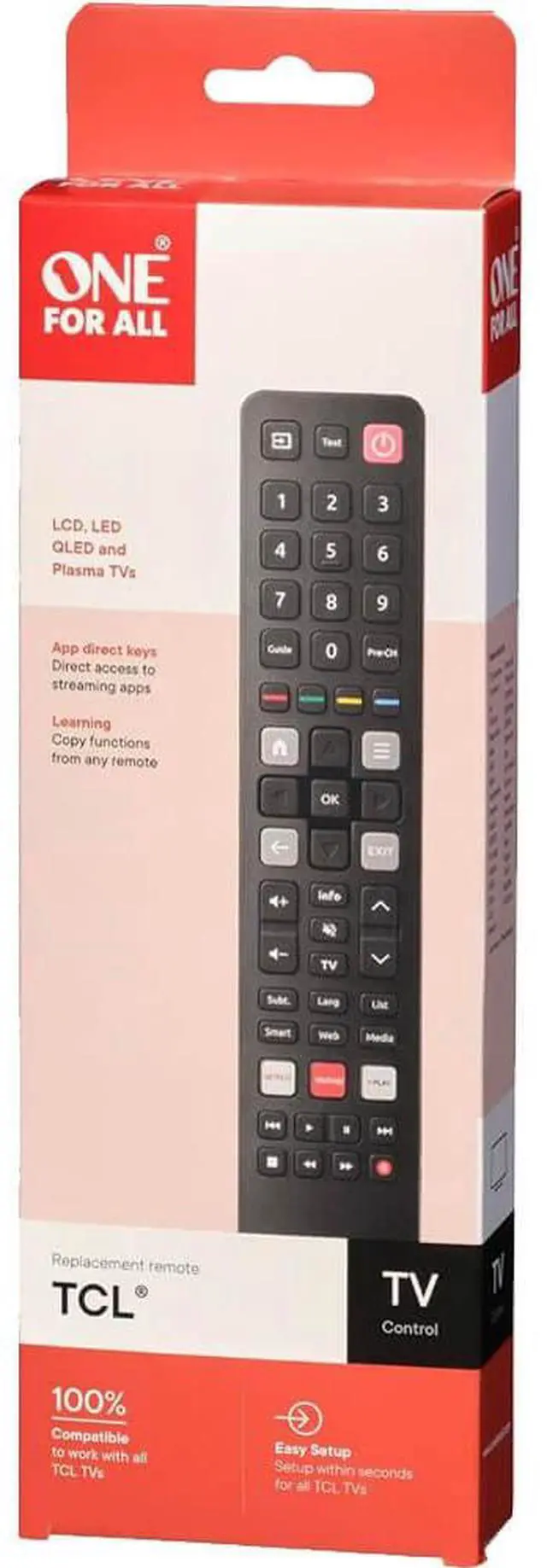 The One For All TCL TV Replacement Remote is the ideal replacement for your original TCL TV remote control. No setup required, simply insert the batteries and start using your remote. Features 3 shortcut keys to your favourite streaming services. 100% compatible with all TCL TVs. No Need to Switch Between Remotes