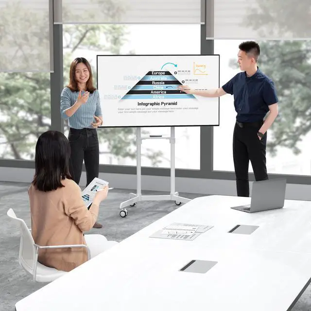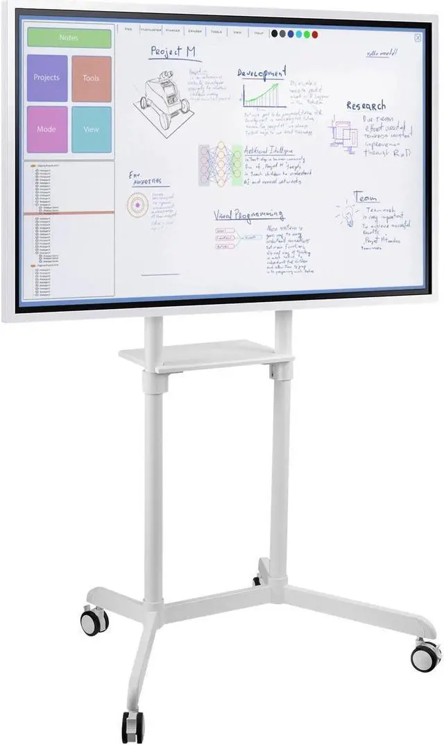 Your digital flipchart went from being a locked-in and stationary to a mobile, rolling station of productivity. And it looks stylish and smooth while doing it too! The lightweight, curved-edge design on this vesa rolling stand will blend easily into your office or home aesthetic without drawing unwanted attention away from what's on your screen.
