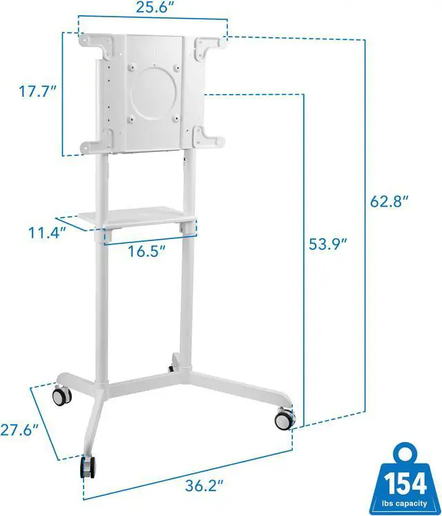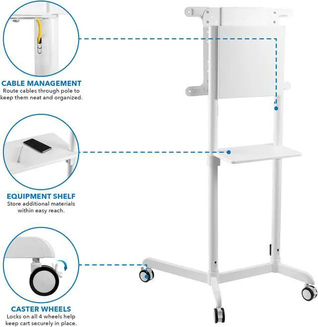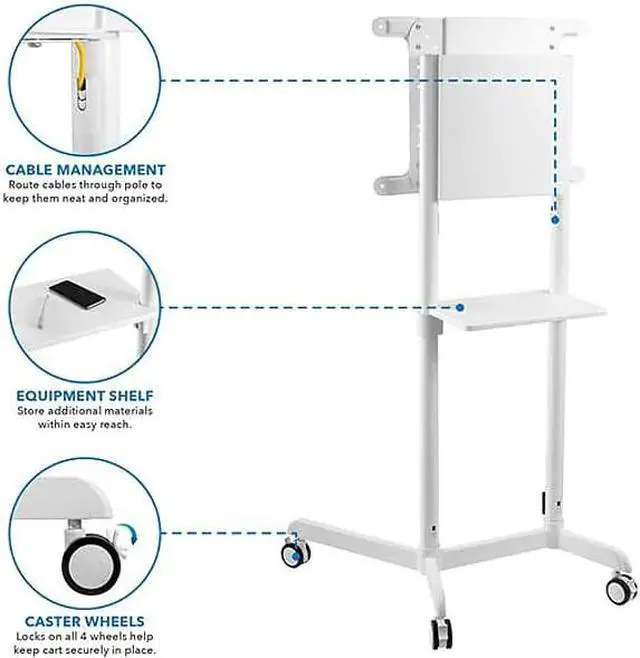 MI-8001 Interactive Screen Stand will instantly transform your digital flipchart, tv, or interactive touchscreen display into an optimal team focused work station that allows you to make the most of your meetings or presentations. Using high quality steel and materials, we've manufactured and engineered this mobile tv stand with wheels to hold up to 154 lbs. We've even added cable management to hide your wires and cables, and a bonus middle shelf tray for easy arms reach access to any of your audio/video equipment, office supplies, or markers. When you need to move from one room to the next, simply glide across the halls using the four built-in omnidirectional casters at the base of this tv stand mobile cart.