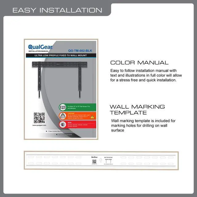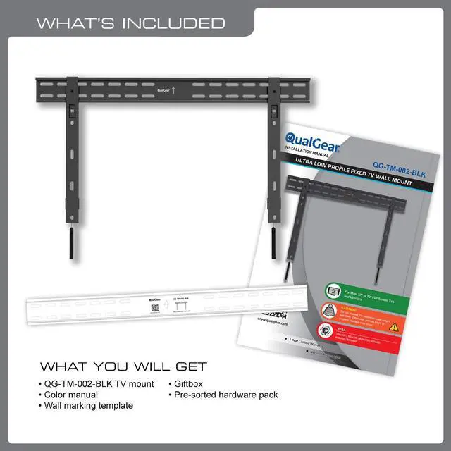 With an impressively ultra low mounting profile of just 0.39 -Inch from the wall, the QualGear QG-TM-002-BLK model is a super slim mount perfectly suited to complement your contemporary style and envy your friends and neighbors by showing off your flat TV installation. This mount supports most 37-Inch to 70-Inch flat panel TVs up to 66 lbs. This mount is part of the Ultra Low Profile Series of fixed mounts offering a sleek and slim design combined with easy installation.